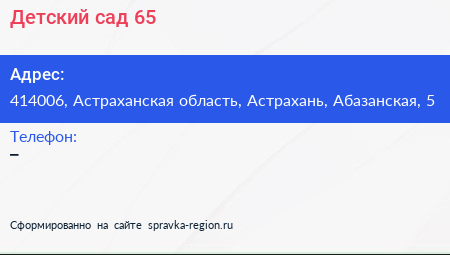 Детский сад №65 по адресу 414006, Астраханская область, Астрахань, Абазанская, 5 в дальнейшем Организация, размещена в следующих категориях: