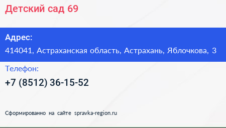 Детский сад №69 по адресу 414041, Астраханская область, Астрахань, Яблочкова, 3 в дальнейшем Организация, размещена в следующих категориях: