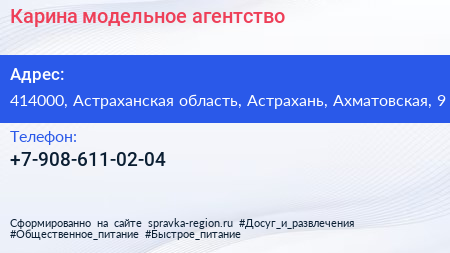 Карина, модельное агентство по адресу 414000, Астраханская область, Астрахань, Ахматовская, 9 в дальнейшем Организация, размещена в следующих категориях: