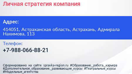 Личная стратегия, компания по адресу 414051, Астраханская область, Астрахань, Адмирала Нахимова, 113 в дальнейшем Организация, размещена в следующих категориях: