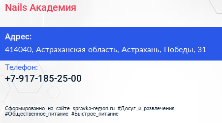 Nails Академия по адресу 414040, Астраханская область, Астрахань, Победы, 31 в дальнейшем Организация, размещена в следующих категориях:
