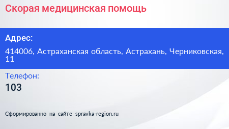 Скорая медицинская помощь по адресу 414006, Астраханская область, Астрахань, Черниковская, 11 в дальнейшем Организация, размещена в следующих категориях: