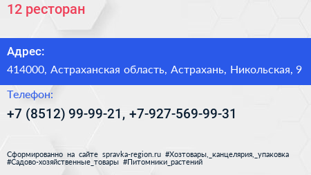 12, ресторан по адресу 414000, Астраханская область, Астрахань, Никольская, 9 в дальнейшем Организация, размещена в следующих категориях: