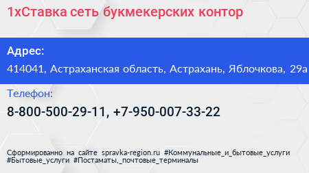 1xСтавка, сеть букмекерских контор по адресу 414041, Астраханская область, Астрахань, Яблочкова, 29а в дальнейшем Организация, размещена в следующих категориях:
