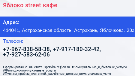 Яблоко street, кафе по адресу 414041, Астраханская область, Астрахань, Яблочкова, 23а в дальнейшем Организация, размещена в следующих категориях: