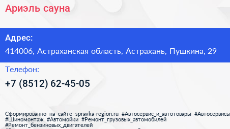 Ариэль, сауна по адресу 414006, Астраханская область, Астрахань, Пушкина, 29 в дальнейшем Организация, размещена в следующих категориях: