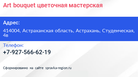 Art-bouquet, цветочная мастерская по адресу 414004, Астраханская область, Астрахань, Студенческая, 4в в дальнейшем Организация, размещена в следующих категориях: