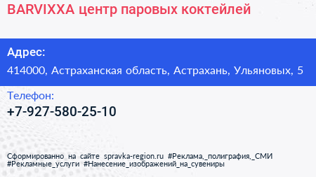 BARVIXXA, центр паровых коктейлей по адресу 414000, Астраханская область, Астрахань, Ульяновых, 5 в дальнейшем Организация, размещена в следующих категориях: