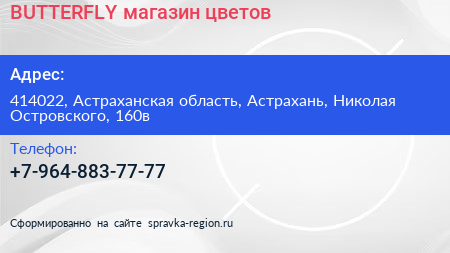 BUTTERFLY, магазин цветов по адресу 414022, Астраханская область, Астрахань, Николая Островского, 160в в дальнейшем Организация, размещена в следующих категориях: