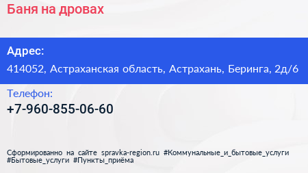 Баня на дровах по адресу 414052, Астраханская область, Астрахань, Беринга, 2д/6 в дальнейшем Организация, размещена в следующих категориях: