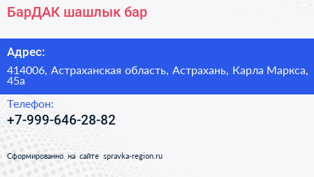 БарДАК, шашлык-бар по адресу 414006, Астраханская область, Астрахань, Карла Маркса, 45а в дальнейшем Организация, размещена в следующих категориях: