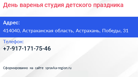День варенья, студия детского праздника по адресу 414040, Астраханская область, Астрахань, Победы, 31 в дальнейшем Организация, размещена в следующих категориях: