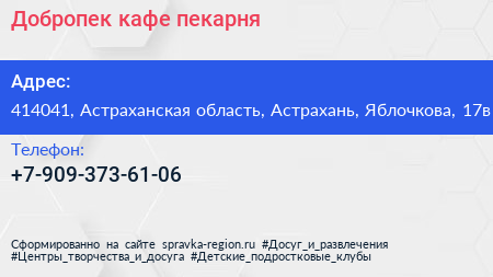 Добропек, кафе-пекарня по адресу 414041, Астраханская область, Астрахань, Яблочкова, 17в в дальнейшем Организация, размещена в следующих категориях: