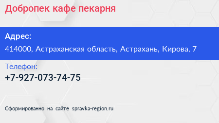 Добропек, кафе-пекарня по адресу 414000, Астраханская область, Астрахань, Кирова, 7 в дальнейшем Организация, размещена в следующих категориях: