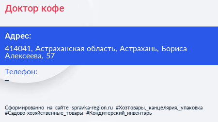 Доктор кофе по адресу 414041, Астраханская область, Астрахань, Бориса Алексеева, 57 в дальнейшем Организация, размещена в следующих категориях: