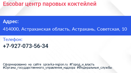 Escobar, центр паровых коктейлей по адресу 414000, Астраханская область, Астрахань, Советская, 10 в дальнейшем Организация, размещена в следующих категориях: