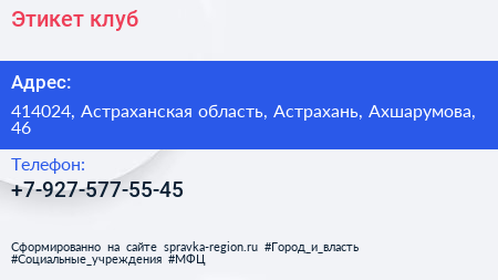 Этикет, клуб по адресу 414024, Астраханская область, Астрахань, Ахшарумова, 46 в дальнейшем Организация, размещена в следующих категориях:
