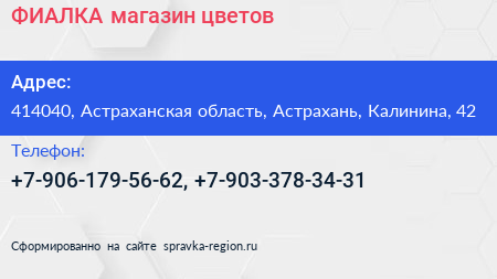 ФИАЛКА, магазин цветов по адресу 414040, Астраханская область, Астрахань, Калинина, 42 в дальнейшем Организация, размещена в следующих категориях:
