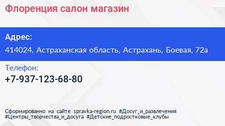 Флоренция, салон-магазин по адресу 414024, Астраханская область, Астрахань, Боевая, 72а в дальнейшем Организация, размещена в следующих категориях:
