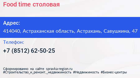 Food time, столовая по адресу 414040, Астраханская область, Астрахань, Савушкина, 47 в дальнейшем Организация, размещена в следующих категориях: