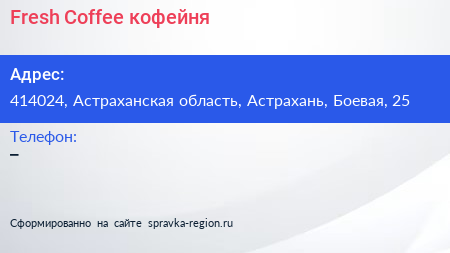 Fresh Coffee, кофейня по адресу 414024, Астраханская область, Астрахань, Боевая, 25 в дальнейшем Организация, размещена в следующих категориях: