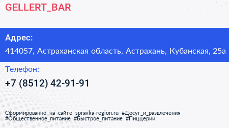 #GELLERT_BAR по адресу 414057, Астраханская область, Астрахань, Кубанская, 25а в дальнейшем Организация, размещена в следующих категориях: