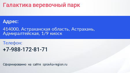 Галактика, веревочный парк по адресу 414000, Астраханская область, Астрахань, Адмиралтейская, 1/9 киоск в дальнейшем Организация, размещена в следующих категориях: