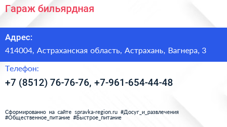 Гараж, бильярдная по адресу 414004, Астраханская область, Астрахань, Вагнера, 3 в дальнейшем Организация, размещена в следующих категориях: