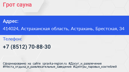 Грот, сауна по адресу 414024, Астраханская область, Астрахань, Брестская, 34 в дальнейшем Организация, размещена в следующих категориях:
