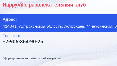 HappyVille, развлекательный клуб по адресу 414041, Астраханская область, Астрахань, Минусинская, 8 в дальнейшем Организация, размещена в следующих категориях: