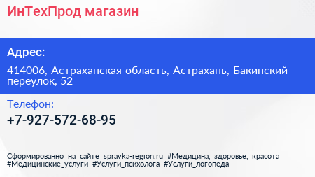 ИнТехПрод, магазин по адресу 414006, Астраханская область, Астрахань, Бакинский переулок, 52 в дальнейшем Организация, размещена в следующих категориях: