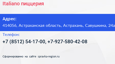 Italiano, пиццерия по адресу 414056, Астраханская область, Астрахань, Савушкина, 24а в дальнейшем Организация, размещена в следующих категориях:
