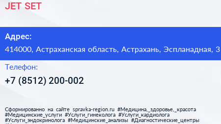 JET SET по адресу 414000, Астраханская область, Астрахань, Эспланадная, 3 в дальнейшем Организация, размещена в следующих категориях: