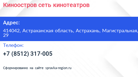 Киноостров, сеть кинотеатров по адресу 414042, Астраханская область, Астрахань, Магистральная, 29 в дальнейшем Организация, размещена в следующих категориях: