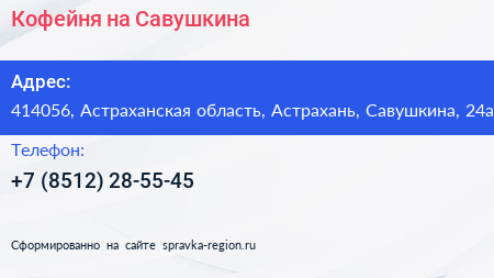 Кофейня на Савушкина по адресу 414056, Астраханская область, Астрахань, Савушкина, 24а в дальнейшем Организация, размещена в следующих категориях: