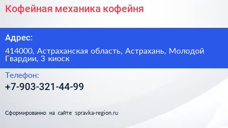 Кофейная механика, кофейня по адресу 414000, Астраханская область, Астрахань, Молодой Гвардии, 3 киоск в дальнейшем Организация, размещена в следующих категориях: