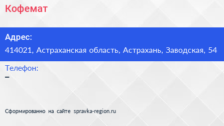 Кофемат по адресу 414021, Астраханская область, Астрахань, Заводская, 54 в дальнейшем Организация, размещена в следующих категориях: