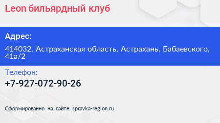 Leon, бильярдный клуб по адресу 414032, Астраханская область, Астрахань, Бабаевского, 41а/2 в дальнейшем Организация, размещена в следующих категориях: