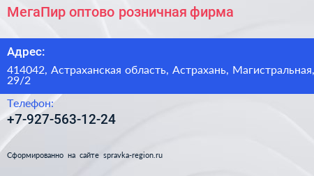 МегаПир, оптово-розничная фирма по адресу 414042, Астраханская область, Астрахань, Магистральная, 29/2 в дальнейшем Организация, размещена в следующих категориях:
