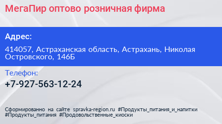 МегаПир, оптово-розничная фирма по адресу 414057, Астраханская область, Астрахань, Николая Островского, 146Б в дальнейшем Организация, размещена в следующих категориях: