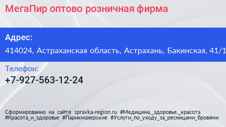 МегаПир, оптово-розничная фирма по адресу 414024, Астраханская область, Астрахань, Бакинская, 41/1 в дальнейшем Организация, размещена в следующих категориях: