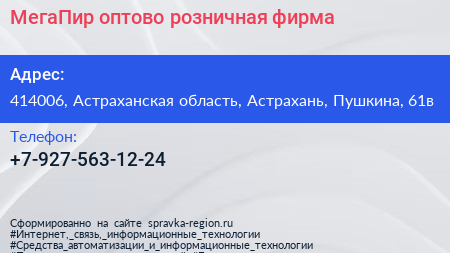 МегаПир, оптово-розничная фирма по адресу 414006, Астраханская область, Астрахань, Пушкина, 61в в дальнейшем Организация, размещена в следующих категориях: