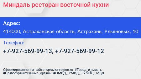 Миндаль, ресторан восточной кухни по адресу 414000, Астраханская область, Астрахань, Ульяновых, 10 в дальнейшем Организация, размещена в следующих категориях: