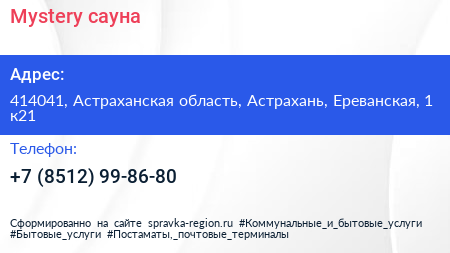 Mystery, сауна по адресу 414041, Астраханская область, Астрахань, Ереванская, 1 к21 в дальнейшем Организация, размещена в следующих категориях: