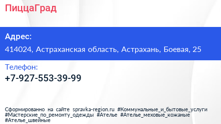 ПиццаГрад по адресу 414024, Астраханская область, Астрахань, Боевая, 25 в дальнейшем Организация, размещена в следующих категориях: