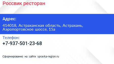 Россвик, ресторан по адресу 414018, Астраханская область, Астрахань, Аэропортовское шоссе, 15а в дальнейшем Организация, размещена в следующих категориях: