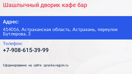 Шашлычный дворик, кафе-бар по адресу 414016, Астраханская область, Астрахань, переулок Бутлерова, 3 в дальнейшем Организация, размещена в следующих категориях: