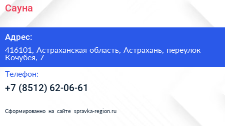 Сауна по адресу 416101, Астраханская область, Астрахань, переулок Кочубея, 7 в дальнейшем Организация, размещена в следующих категориях:
