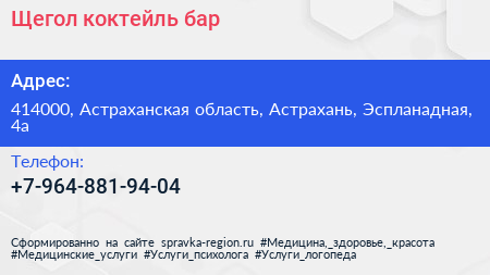 Щегол, коктейль-бар по адресу 414000, Астраханская область, Астрахань, Эспланадная, 4а в дальнейшем Организация, размещена в следующих категориях: