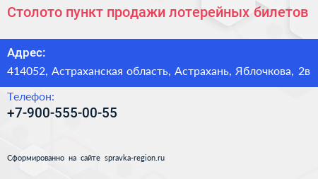 Столото, пункт продажи лотерейных билетов по адресу 414052, Астраханская область, Астрахань, Яблочкова, 2в в дальнейшем Организация, размещена в следующих категориях: